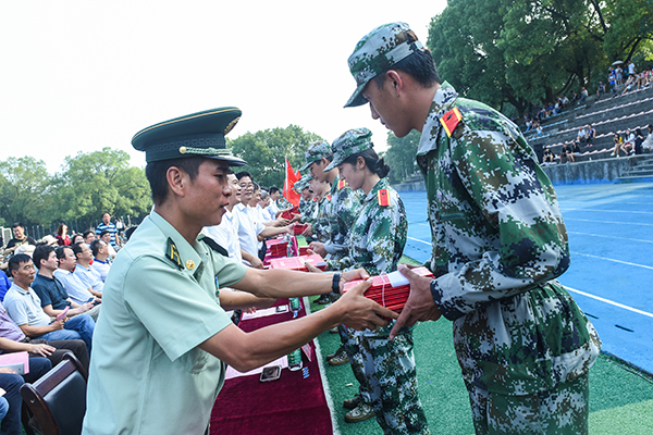 唐艳明宣读军训表彰文件,对音乐与舞蹈学院等5个军训工作先进单位、音乐与舞蹈学院学院2连等25个优秀连队、蒋志平等30名优秀教官以及人文与社会科学学院桃五640室等70间优秀宿舍进行了表彰。