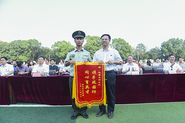 陈弘向武警军训教官赠送锦旗。