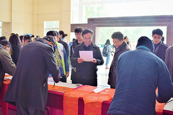 本网讯 1月11日中午,学校开展的“春满科院 联动人心”写春联送春联活动现场人流如织、喜气洋洋,校党委书记陈弘、校党委副书记唐艳明、副校长程智开、工会主席陈仲庚等饶有兴致地来到活动现场,程智开、欧小松、唐幼铎、曹先兵、李国家、夏三鳌、谷显明等书法研究所成员及2017年现场书法大赛获奖学生现场挥毫写联,为全校师生送上了新年祝福。