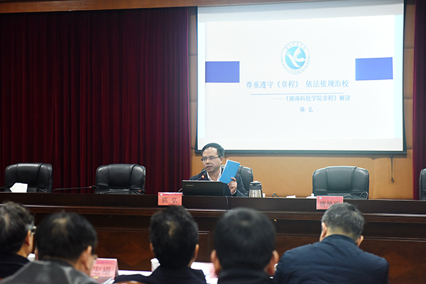 本网讯 12月13日晚,党委书记陈弘以“尊重遵守《章程》 依法依规治校”为主题为第四届教职工代表、工会会员代表进行专题培训,对《8868官方网站章程》作全面深入地讲解分析。党委副书记唐艳明主持。