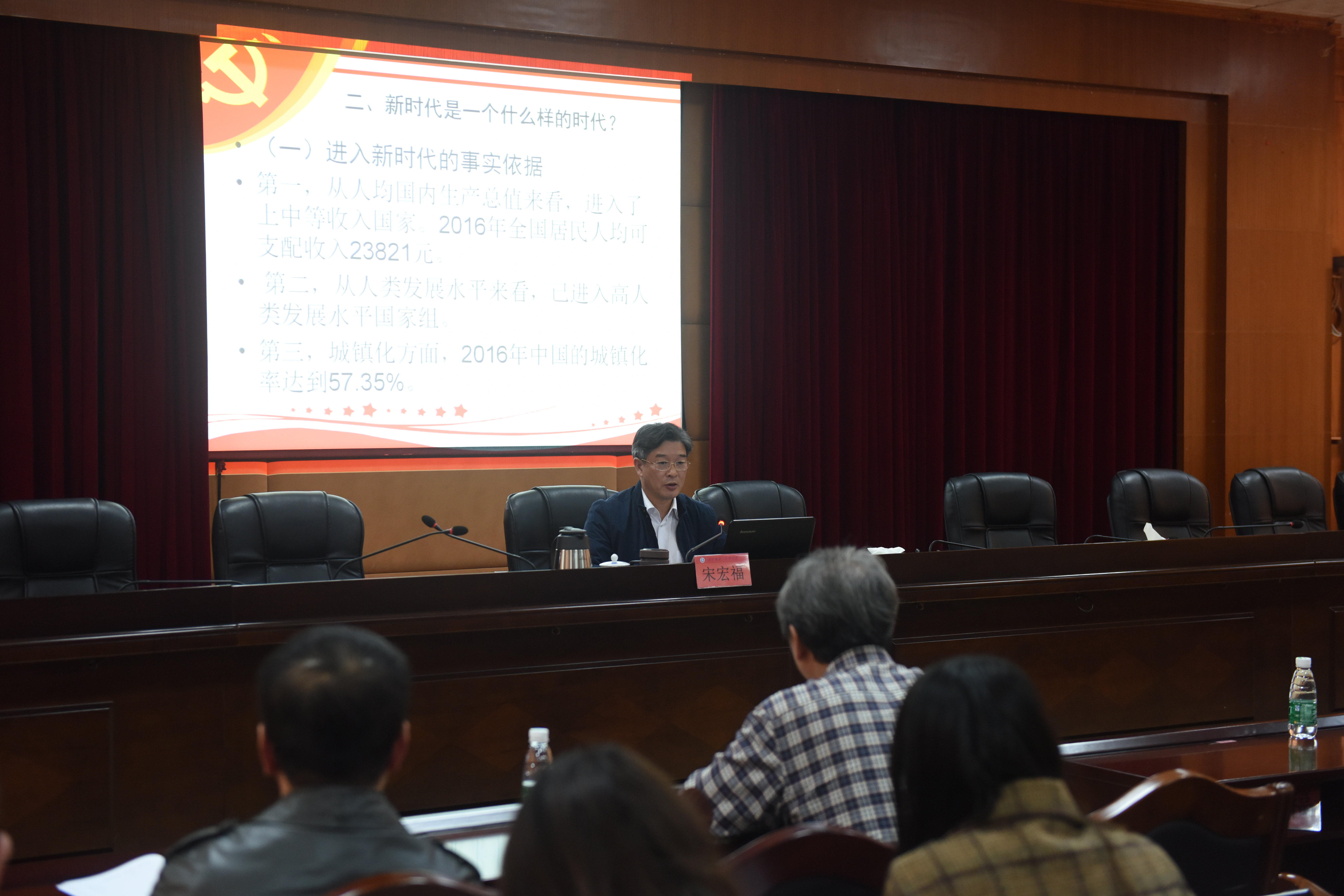 宋宏福从十九大的印象、新时代的诠释和新时代要有新作为三个方面,对新时代的丰富内涵、新时代的主要矛盾、新时代的指导思想等重要内容进行了阐述和解读。他结合学校的发展实际分享了自己对新时代教育的体会,勉励教师党员要坚守大学的理想和愿景,争做优秀教师,营造好的课堂。他还从自身的工作实际出发分享了对推进内涵建设、释放人才活力的感悟。