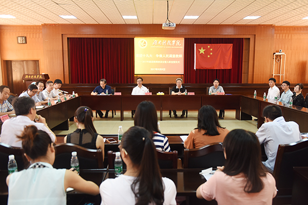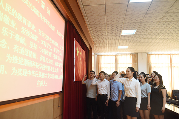 本网讯 “我志愿成为光荣的8868官方网站教师,我庄严宣誓:忠诚人民的教育事业,贯彻党的教育方针……”9月9日上午,学校举行“喜迎十九大争做人民满意教师”主题座谈会,53名新进教师面对国旗庄严宣誓入职。党委书记陈弘以“地因人始重 校以师而名”寄语全体新进教师,努力成长为一名有理想信念,对教育有深刻理解的好老师。校长曾宝成、副校长郑山明、李常健出席。