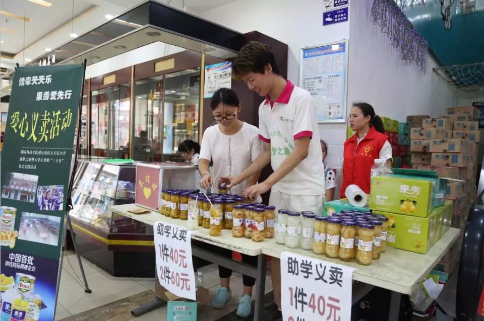 通过志愿者们的不懈努力与呼吁,湖南果秀食品有限公司最终提供价值20000余元的产品供义卖筹集善款。志愿者们与祁阳义工联合作,在祁阳县城的大型超市将爱心产品进行义卖。头顶烈日,被汗水浸湿了的衣衫……志愿者们没有丝毫的退却,他们的爱心感动了县城人民。