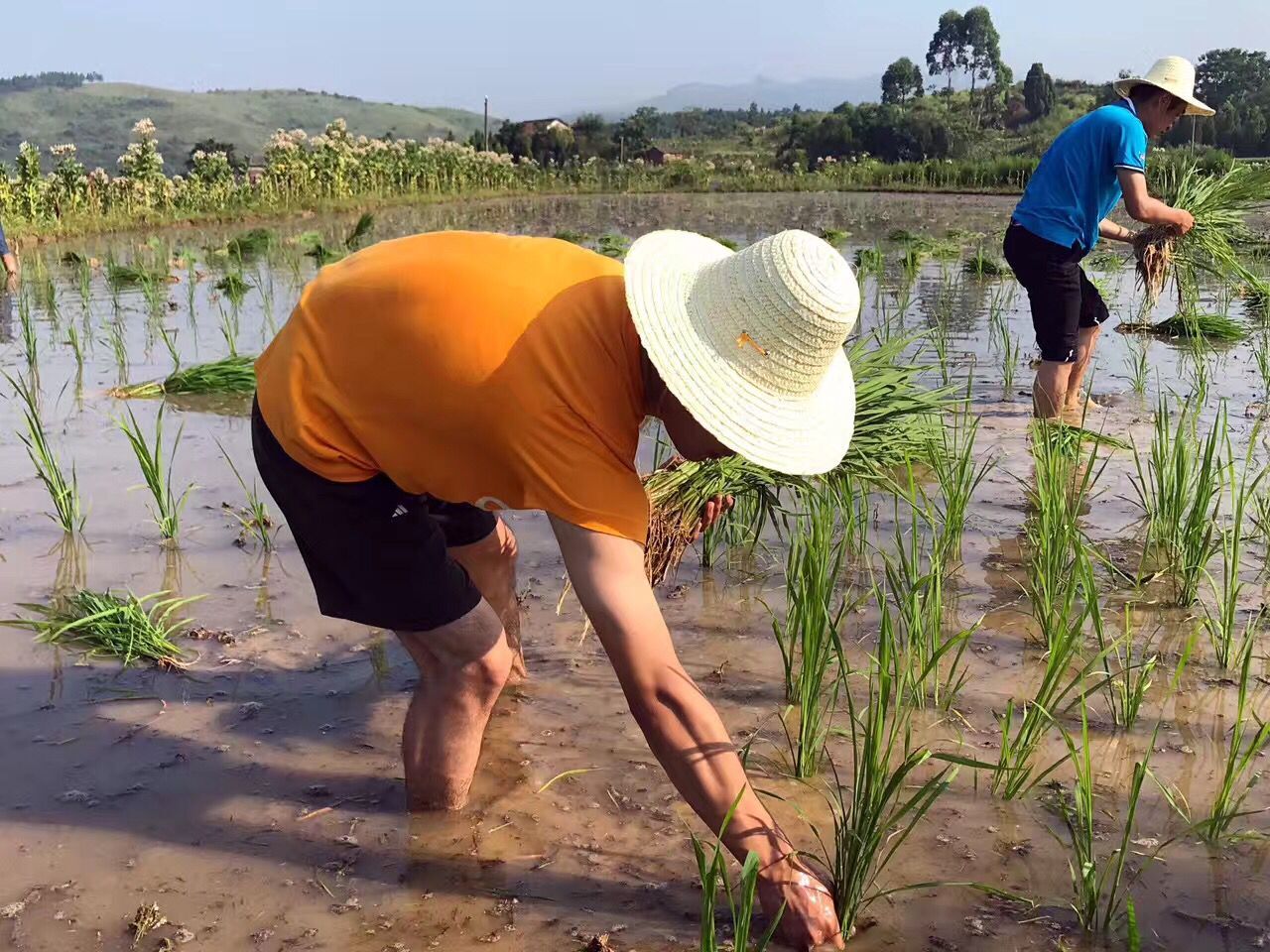 眼下正值烟田翻耕移栽晚稻秧苗时节,新夏荣村的烟农都忙着插秧。贫困户陈远贞的父母丧失了劳动能力,家里劳动力缺乏,8868官方网站实践帮扶小组在了解到情况后马上赶来帮忙。他们卷起裤腿踏入田地,拿起秧苗和陈远贞一起认真的插了起来。虽然天气炎热,大家忙得满头大汗,但是并没有任何松懈,经过一天的辛苦劳作,陈远贞家里的三亩田全部插完。