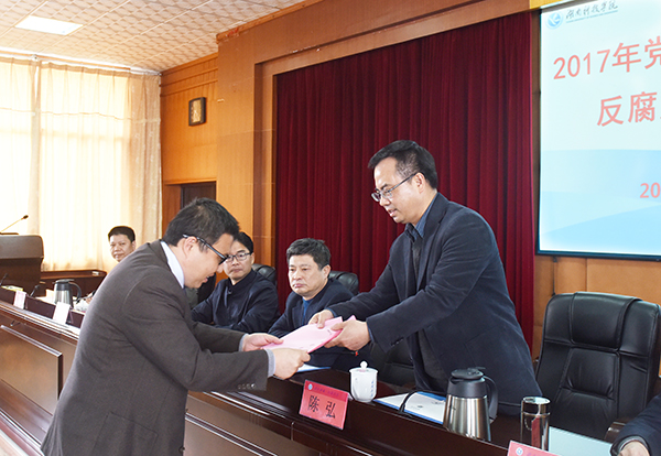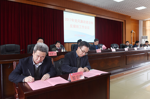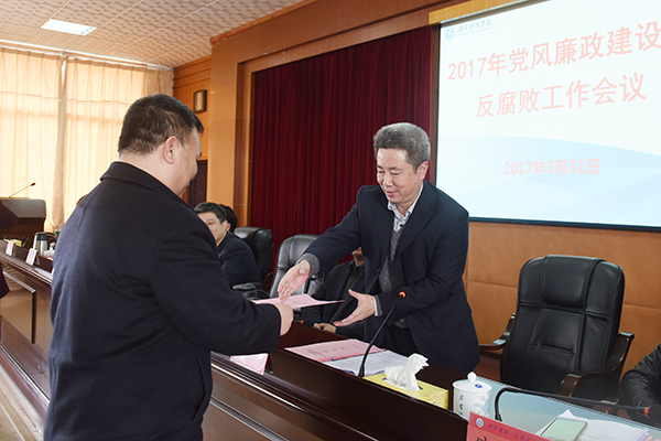 会议正式开始前,全体与会人员开展了《8868官方网站廉政公约》签名活动。会上,校领导班子成员分别向党委书记陈弘同志签订并递交了《党风廉政建设目标管理责任书》,各二级单位党政负责人分别向分管校领导签订并递交了责任书。