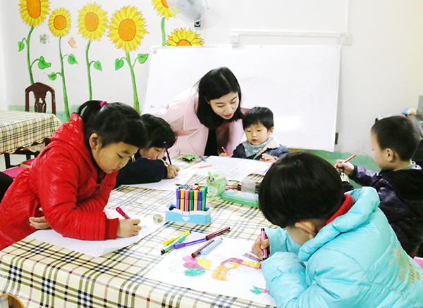 教室里坐满了挥动着画笔的孩子,他们正在学着勾勒、上色,忙得不亦乐乎。秦游涵率先完成了作品,他兴奋地跳了起来,给这个看看,给那个瞧瞧,其他小朋友也不甘示弱,红彤彤的小脸上有着一股执拗的神情,小手攥紧了彩笔,一笔一划的涂上自己喜欢的颜色,红的,绿的,黄的……每一份不同的图画代表了一颗纯真的心。