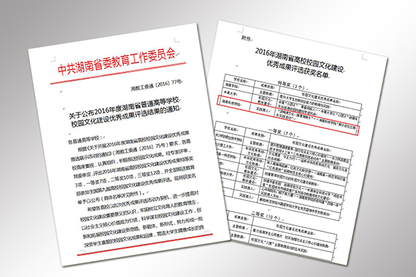 在省委教育工委下发的通知(湘教工委通〔2016〕77号)中显示,本次全省评选出高校校园文化建设优秀成果特等奖3项,一等奖7项,二等奖10项,三等奖12项,这些成果将报送教育部参加全国第八届高校校园文化建设优秀成果评选。