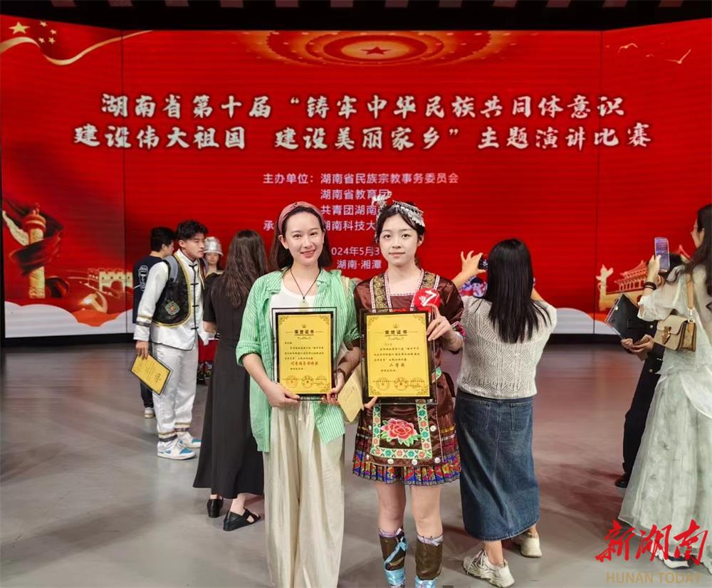 湖南日报·新湖南客户端6月7日讯(通讯员 向薛峰)近日,湖南省第十届“铸牢中华民族共同体意识 建设伟大祖国 建设美丽家乡”主题演讲比赛在湘潭市举行,赛事由湖南省民族宗教事务委员会、湖南省教育厅、共青团湖南省委联合主办,湖南科技大学承办。8868官方网站传媒学院学生周怡希代表永州市高校参加比赛,荣获高校组二等奖,袁晓琳老师荣获“优秀指导老师奖”。