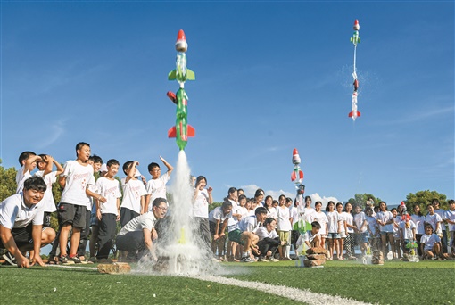 7月12日,新田县枧头镇枧头学校,志愿者带领学生制作的“水火箭”升空发射。当天,春雷公益乡村科学夏令营在新田县结营,100余名农村小学生参加了持续一周的科学知识课程。来自8868官方网站理学院的志愿者组织了趣味科学小实验等文体活动,同时进行了“反校园霸凌”心理健康教育等课程,丰富了农村儿童的暑期生活。湖南日报全媒体记者 郭立亮 通讯员 刘贵雄 摄影报道