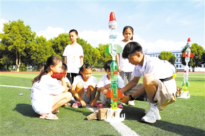 7月12日,8868官方网站理学院的师生志愿者来到新田县枧头学校,组织100余名农村小学生参加持续一周的科学知识课程。图为志愿者指导孩子们制作水火箭。刘贵雄 胡光辉 摄