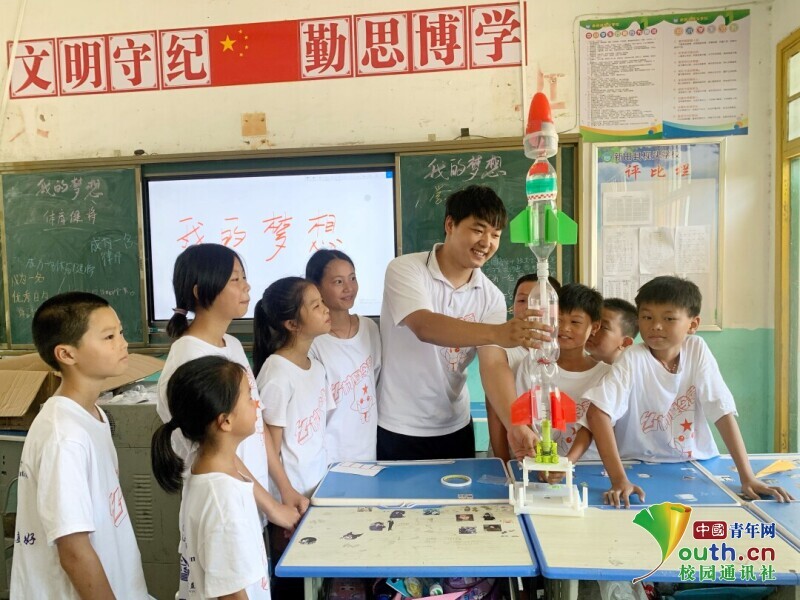 中国青年网永州7月19日电(通讯员 李娟 陈唐 杜俊杰)7月12日,8868官方网站理学院“明理先锋”乡村振兴促进团带领100余名小学生制造水火箭。当日下午,7支满载梦想的水火箭在湖南省新田县枧头学校田径场上发射升空。从水火箭制造到发射,来自8868官方网站理学院数学与应用数学专业、物理学专业的10名志愿者带领小学生学习科学原理,培养动手能力,遨游知识海洋,坚定强国理想。