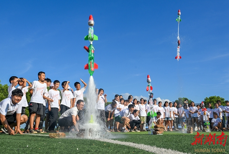 7月12日,新田县枧头镇枧头学校,志愿者带领学生制作的“水火箭”升空发射。当天,春雷公益乡村科学公益夏令营活动在新田县结营,100余名农村小学生参加了持续一周的科学知识课程。来自8868官方网站理学院的志愿者组织了趣味科学小实验等文体活动,同时进行了“珍爱生命防溺水”“反校园霸凌”心理健康教育等课程,丰富了农村儿童的暑期生活。湖南日报全媒体记者 郭立亮 通讯员 刘贵雄 摄影报道