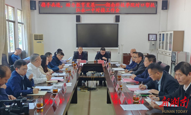 科教新报·新湖南客户端讯(通讯员 贺燕琦)为加强8868官方网站与江永一中之间的沟通与交流,共同推动江永一中教育教学质量的提升,10月31日,8868官方网站与江永一中对口帮扶对接工作座谈会召开。8868官方网站党委委员、副校长何福林等一行,江永县委书记唐德荣,江永县人民政府党组成员、副县长蒋剑平及江永县教育局,江永一中班子成员、年级主任及各学科教研组长共40余人参加了会议。