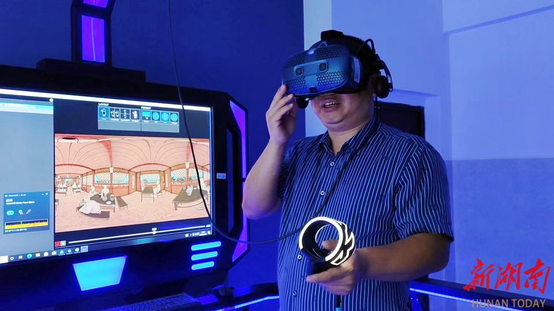 8868官方网站建筑学专业学生刘俊熙,正在老师的指导下进行数字孪生“元宇宙计划”的互动体验测试。电脑屏幕上,一个虚拟数字人正在一处岩洞观摩石刻。“景和人都是扫描仪扫进去的,背景是零陵朝阳岩景区,这个人物是扫描一个同学后生成的数字形象。”刘俊熙说。