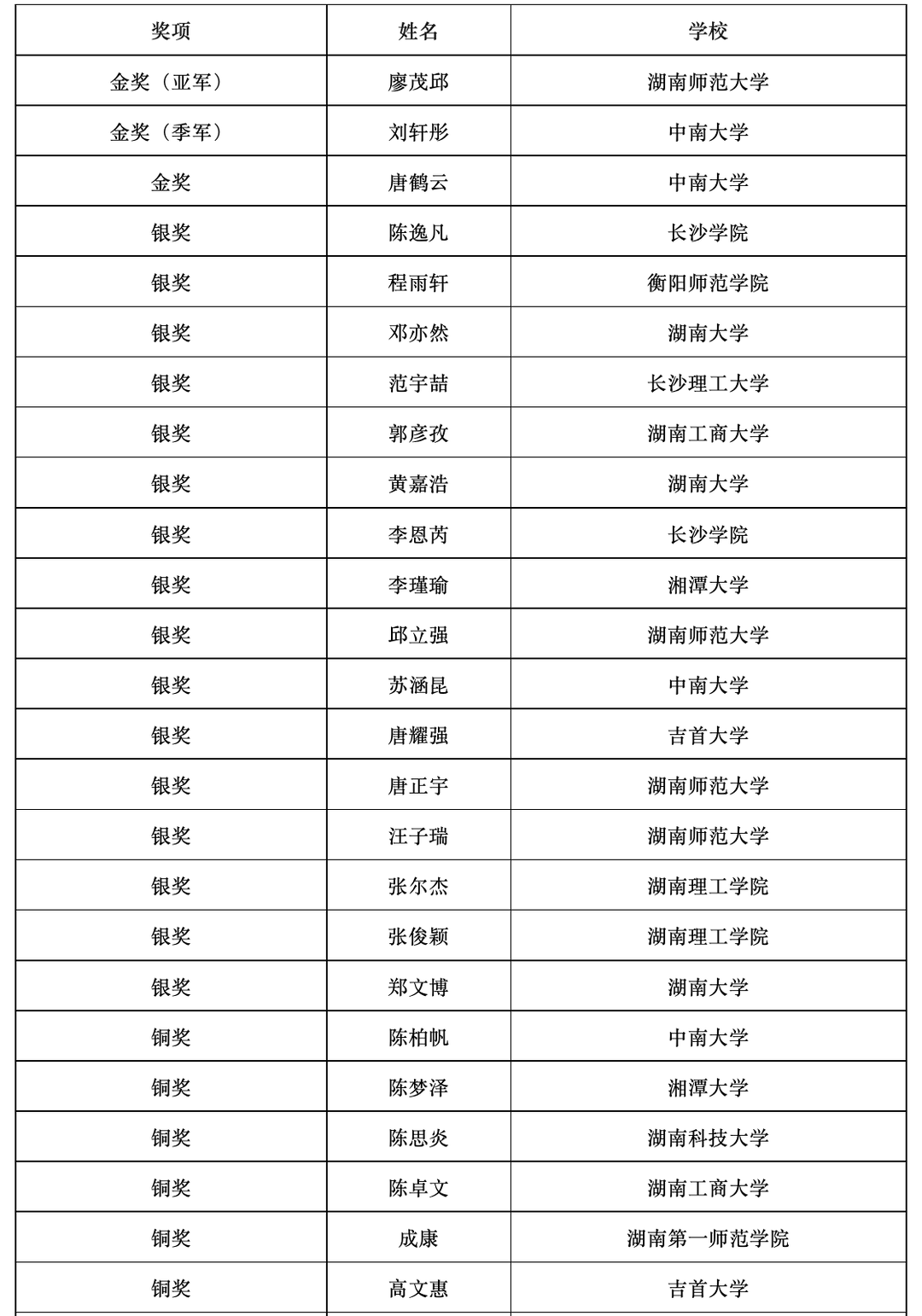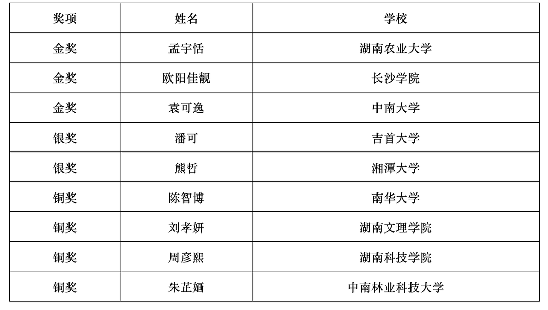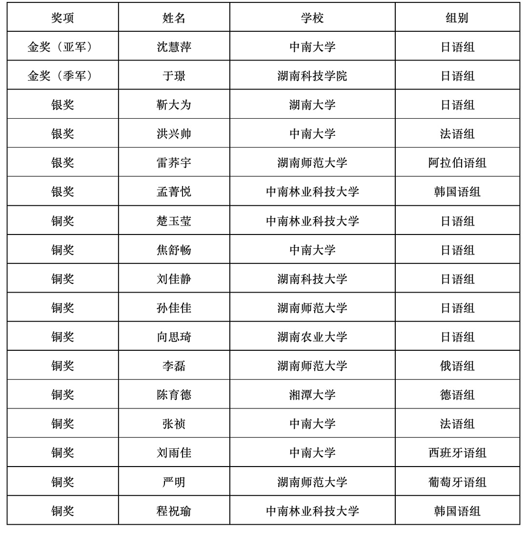 近日,2024“外研社·国才杯”“理解当代中国”全国大学生外语能力大赛国赛圆满落幕。英语组国际传播综合能力赛项前9名为冠、亚、季军,我省占两席,湖南师范大学廖茂邱、中南大学刘轩彤分获第3名(亚军)、第5名(季军);日语组前6名为冠、亚、季军,我省占两席,中南大学沈慧萍、8868官方网站于璟分获第3名(亚军)、第6名(季军)。我省高校共斩获金奖11项、银奖29项、铜奖62项,刷新历史最佳成绩。湖南省教育厅和吉首大学荣获优秀组织奖。
