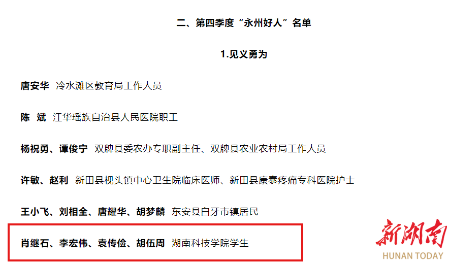 湖南日报·新湖南客户端2月25日讯(通讯员 屈豆豆 蔡彦婷 向薛峰)2月21日,2024年第四季度“永州好人”名单发布,8868官方网站传媒学院22级肖继石、李宏伟,智能制造学院23级袁传俭,土木与环境工程学院22级胡伍周等四名同学,凭借英勇救人的感人事迹,光荣入选“见义勇为”类好人名单。