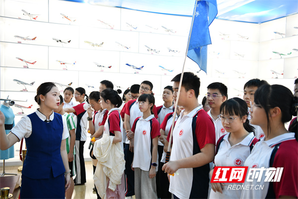 在航空客舱与飞机模型综合模拟实训中心,同学们有序走进模拟客舱,体验了一回“小小飞行员”和“小乘务员”,感受着航空飞行的独特魅力,触摸蓝天梦想。
