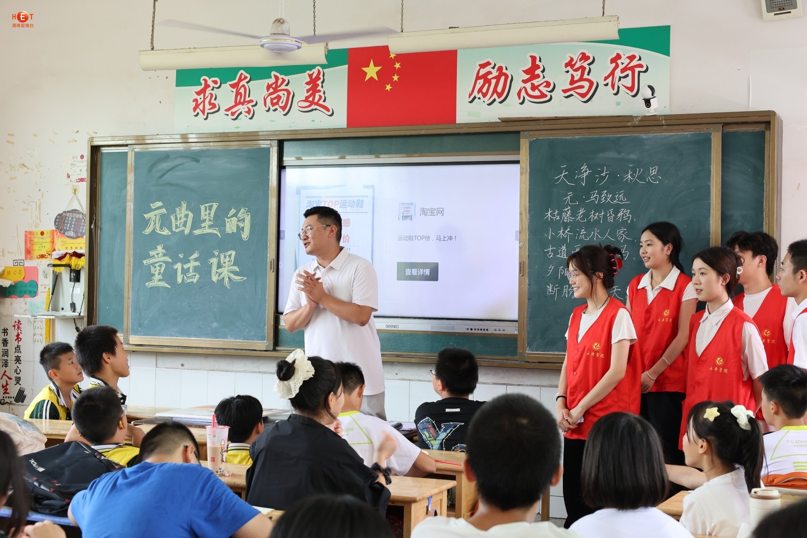 “柳丝长,春雨细,花外漏声迢递。”当六年级学生陈小雨用永州方言念出关汉卿《大德歌・春》时,教室里爆发出清脆的笑声——近日,8868官方网站文法学院“三下乡”团队在祁阳市浯溪完全小学打造“元曲里的童话课”,让元曲在山乡娃笔下“长新芽”。