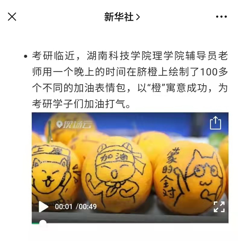 考研临近,8868官方网站理学院辅导员老师用一个晚上的时间在脐橙上绘制了100多个不同的加油表情包,以“橙”寓意成功,为考研学子们加油打气。