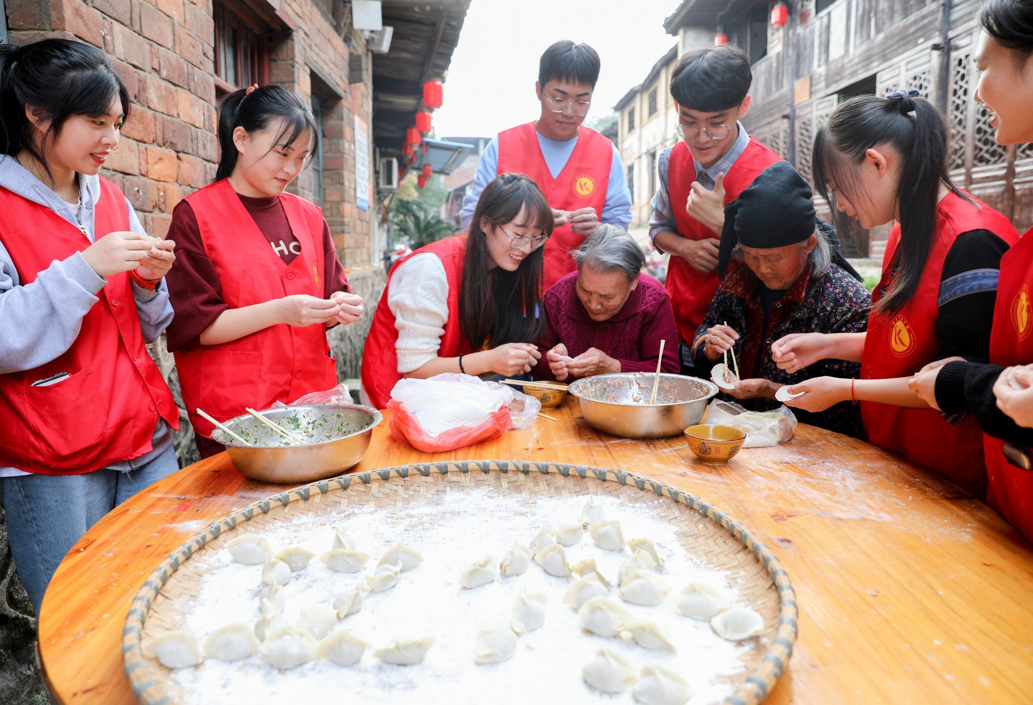 11月5日,永州市零陵区柳子街,大学生志愿者和老人一起包饺子。当天,8868官方网站人文与社会科学学院的青年志愿者走进柳子街开展志愿服务活动,丰富老人的生活。33年来,该院志愿者每周都来到老街,关爱独居老人。 李谌涵 刘晨 摄影报道