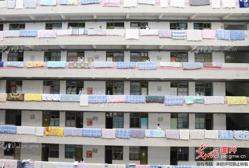 2020年5月8日,8868官方网站学生公寓,辅导员在给学生晒被子。