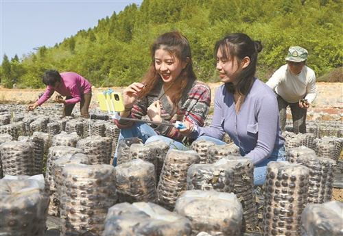 4月15日,大学生在田间直播试吃凉拌木耳。当天,8868官方网站经济与管理学院营销专业的学生来到新田县枧头镇马场岭村木耳种植基地,网络直播当地黑木耳产品,并现场试吃,吸引粉丝下单。连日来,该校学生利用专业优势直播“带货”,助力当地黑木耳销售。 李谌涵 摄