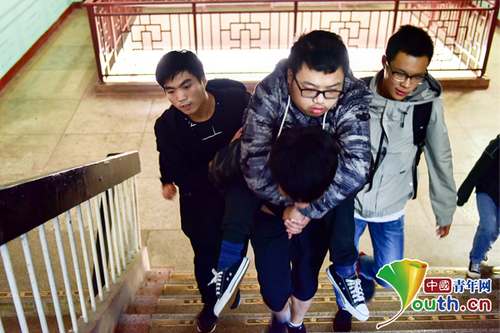 中国青年网北京10月16日电 10月15日上午7点50分,第一节课马上要开始了,8868官方网站学生赵学成背起同学黎际勤,起身走向五楼的教室。这一幕,自今年9月份开学以来,在8868官方网站不断地上演着。