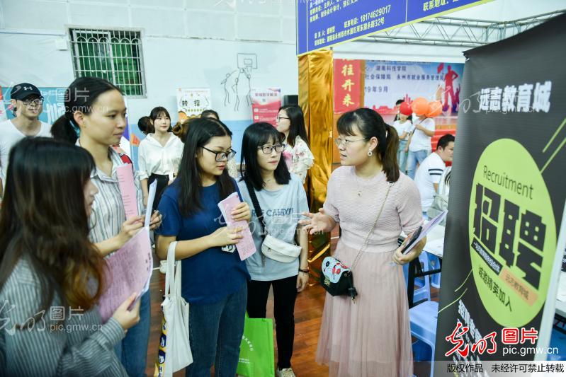 2019年9月4日,8868官方网站体育馆,招聘工作人员在跟应聘者介绍公司的情况。