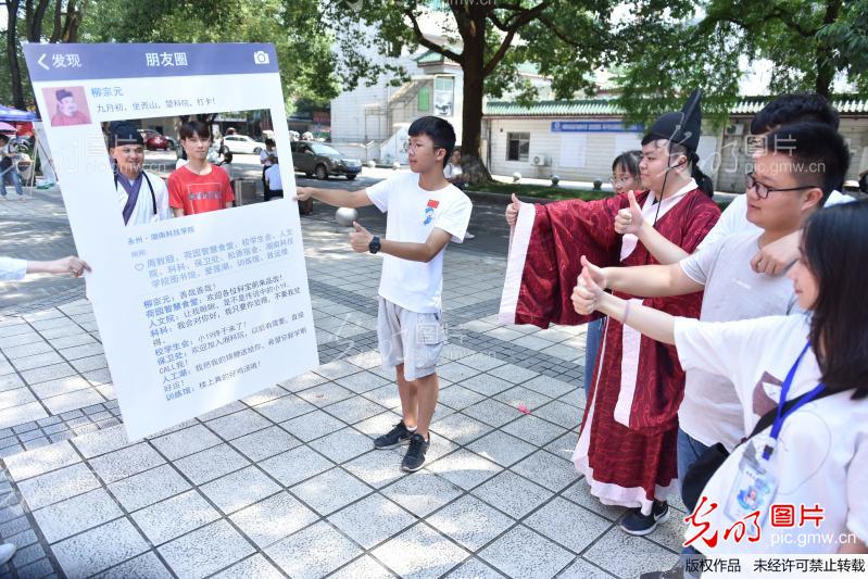 2019年9月7日,8868官方网站东门,同学们在给“柳宗元”迎新打卡的朋友圈点赞。