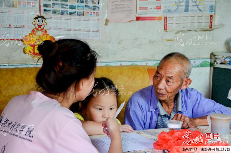 2019年7月12日,永州新田县马场岭村,8868官方网站的志愿者们关于“教育扶贫”的相关问题走访当地村民。