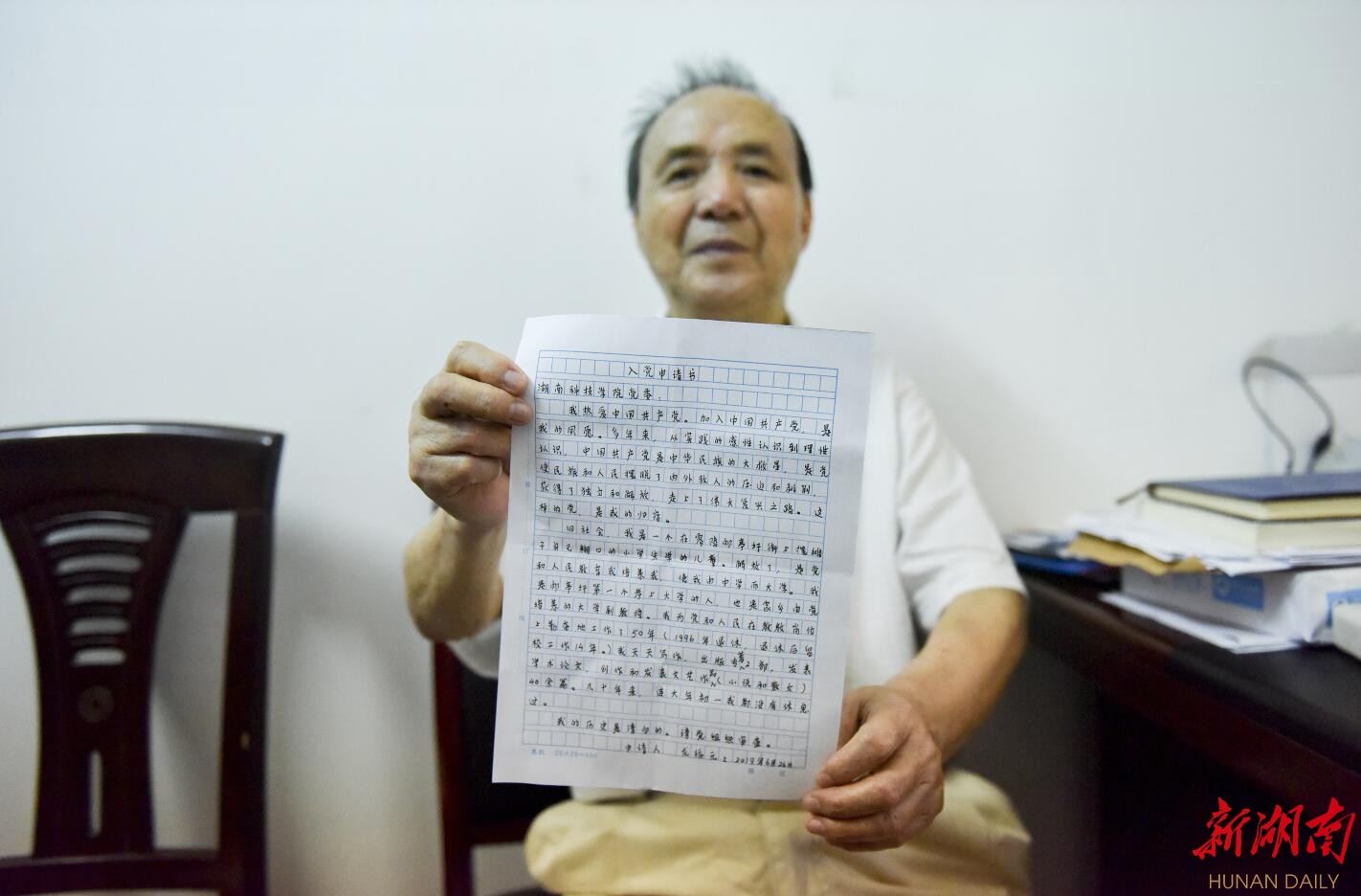新湖南客户端6月27日讯(通讯员 李谌涵 夏汉伟 记者 左丹)“我热爱伟大的中国共产党,加入共产党是我毕生的夙愿……”6月26日一早,8868官方网站84岁的老教师龙福元来到该校离退休处党总支办公室,郑重地向离退休处党总支书记刘剑非递交上他的入党申请书。