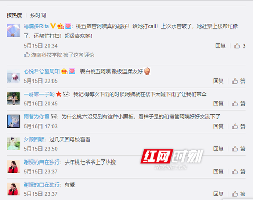 “阿姨特别关心我们,知道我生病以后还去医务室看了我,哇,超级感动!”“阿姨冒着雨替我们收晒在栏杆上的被子。”“阿姨经常嘘寒问暖,让异地求学的我感到特别暖。”“阿姨特别年轻活力,就像一个‘小仙女’,温柔体贴。”除了宿舍通知栏,学校官方微博上的表白墙也很火,两位宿管阿姨被学生频繁表白“因为有你在,科院就是家。”