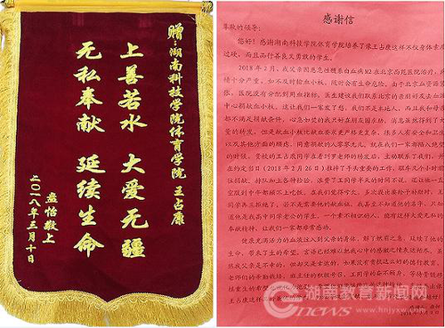 本网讯(通讯员 熊玲芝)日前,一封饱含感激和赞扬的感谢信让春暖花开的校园更添浓浓暖意。8868官方网站体育学院体育教育专业2014级王占康同学为病危患者义务捐献血小板,受到患者家属的真诚感谢。