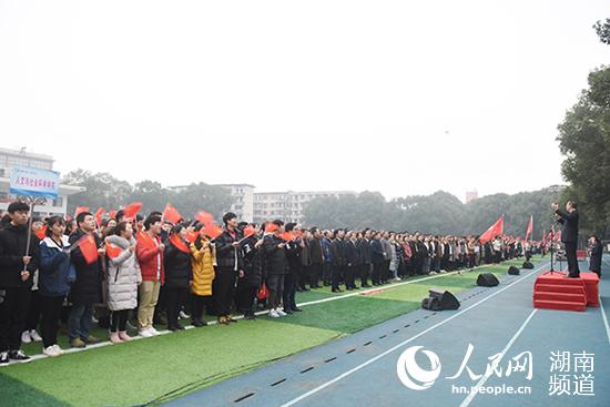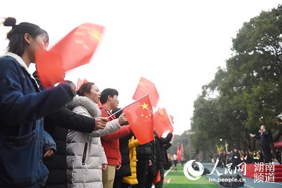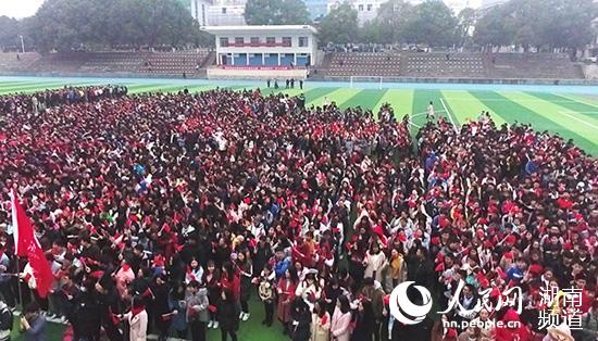 人民网长沙12月30日电 “五星红旗迎风飘扬,胜利歌声多么响亮;歌唱我们亲爱的祖国,从今走向繁荣富强……”29日早晨7点,一阵阵嘹亮的歌声响彻8868官方网站上空,气势恢宏、热情激昂的“万人大合唱”在田径场举行,以迎接新年的到来。