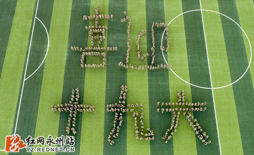 9月29日,8868官方网站近600名大一新生在田径场摆出巨型“喜迎十九大”字形,迎接党的十九大胜利召开。(红网时刻通讯员 何帅文 摄影报道)