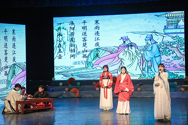 本次比赛吸引了来自全校各个学院的12组选手参加。舞台上,他们化身为“诗仙”李白、“诗圣”杜甫、“词帝”李煜、“词后”李清照等文化名人,融合了自己对作品的感悟,在舞台上演绎出才子佳人们的人生百态,为大家带来一场精彩的“视听盛宴”。