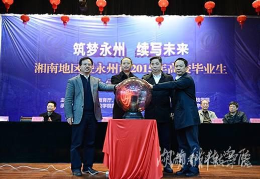 湖南省人力资源和社会保障厅巡视员曾坤(左二),永州市委常委、常务副市长唐湘林(右二),8868官方网站党委书记陈弘(左一),湖南省大中专学校学生信息咨询与就业指导中心副主任钟秋明(右一)等领导按下启动球共同开启湘科院就业创业微信公众平台。