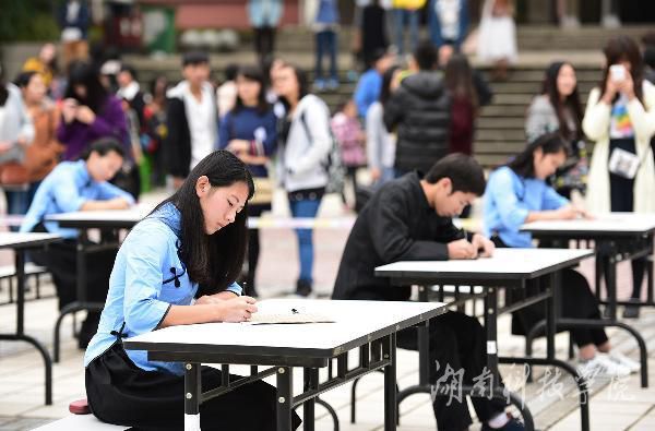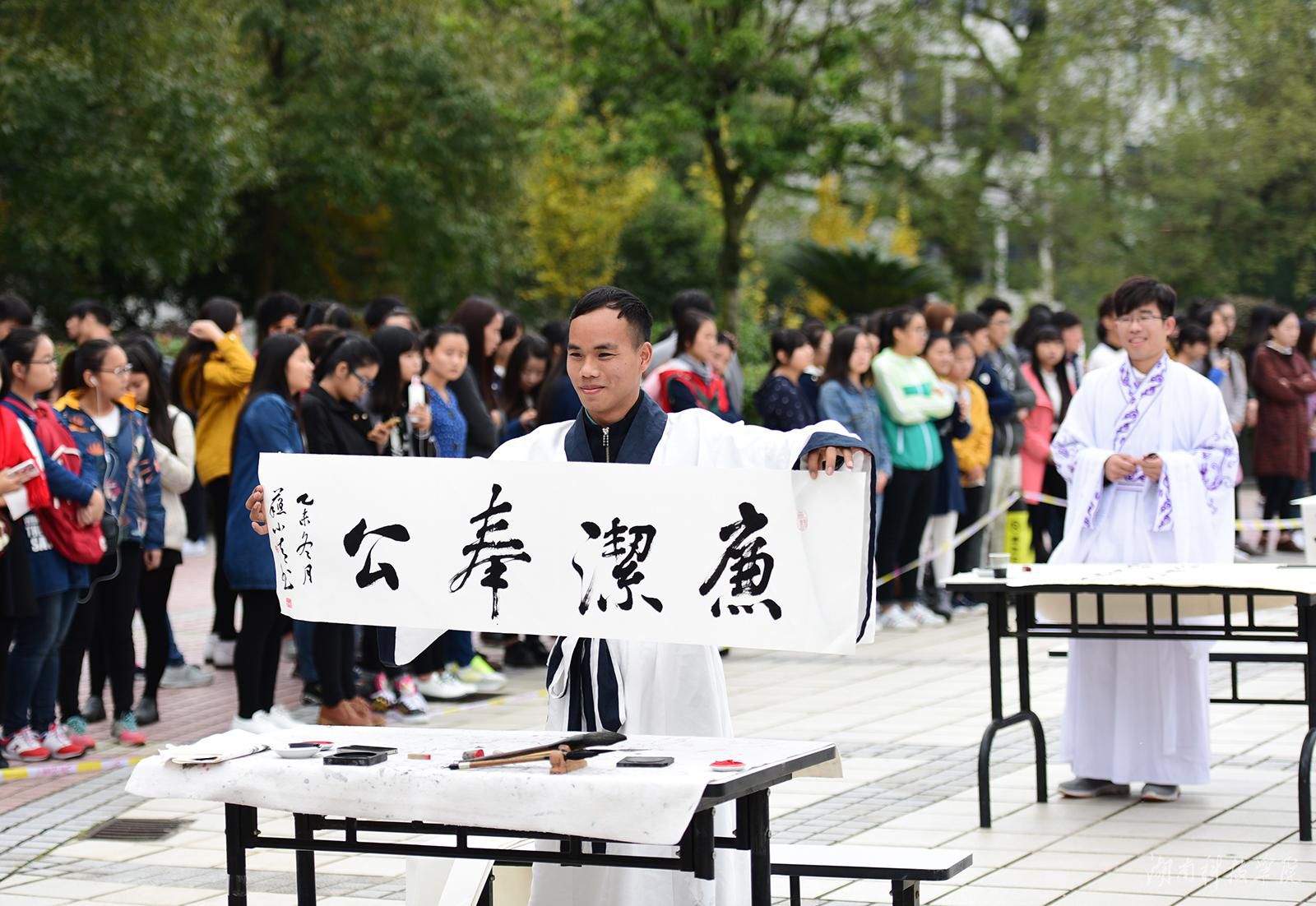 本网讯 挥毫遒劲书正气, 翰墨飘香展清廉。11月22日,8868官方网站近千名师生陶醉在悠扬婉转的古筝声中,欣赏了一场学子着汉服、民国服装现场挥毫泼墨的弘扬传统文化的视觉盛宴。