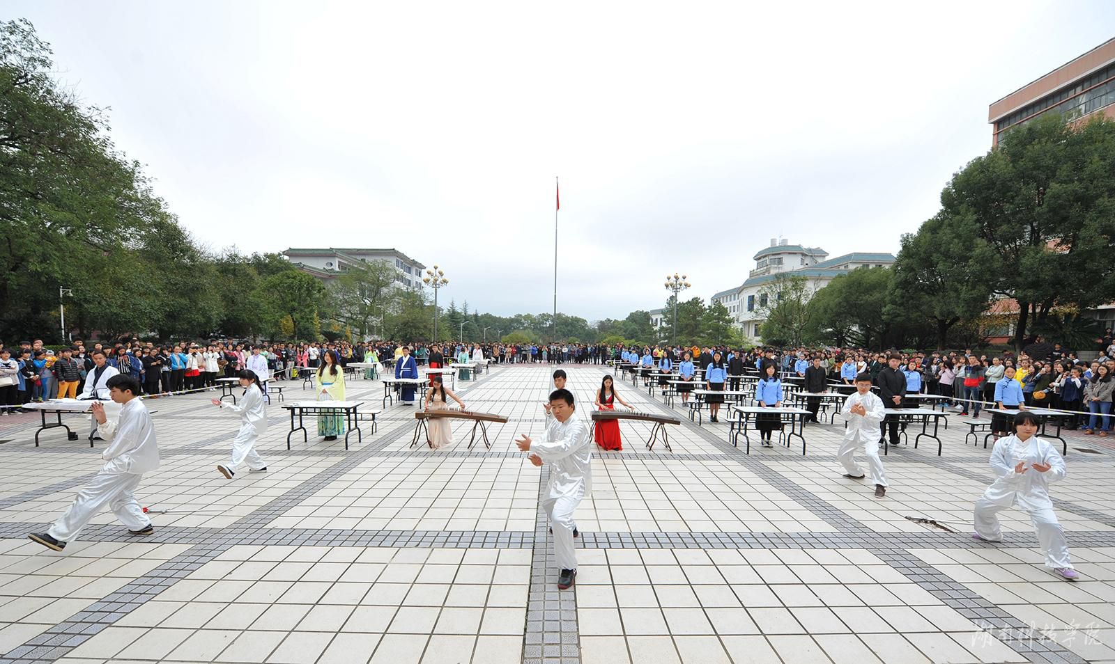 该校在文化广场举行现场书法大赛,硬笔组学生着民国服装,软笔组学生着汉服,为现场观众完美展示了书法的笔精墨妙。伴随着轻柔舒缓的古筝乐声响起,太极拳表演者以抱拳动作起势,把中国博大精深的传统文化与艺术之美巧妙融合,展示了无与伦比的人文艺术之美。