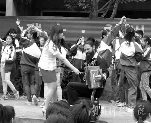 4月20至23日,瑞士4名民间音乐、舞蹈艺术家先后来到永州第八中学、第十一中学和8868官方网站,与学校师生开展了丰富多彩的文化艺术交流和教学活动,受到热烈欢迎,图为瑞士艺术家与同学们同台表演。 唐荣刚 摄