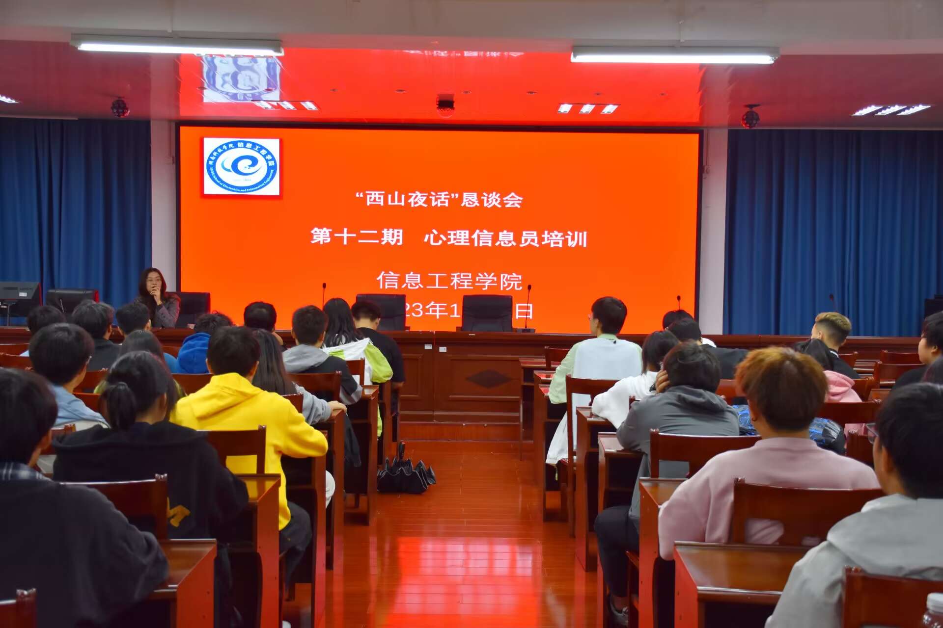 本网讯(通讯员 李思翰 刘兵兵)11月8日,信息工程学院在知行楼107举办第十二期“西山夜话”恳谈会。本期活动邀请信息工程学院学工办主任、心理专干唐鹤轩老师担任主讲嘉宾,信息工程学院各班心理委员、寝室长70余人参加,大家围绕“培育健康心灵,守护美好未来”主题,分享故事,畅谈未来。