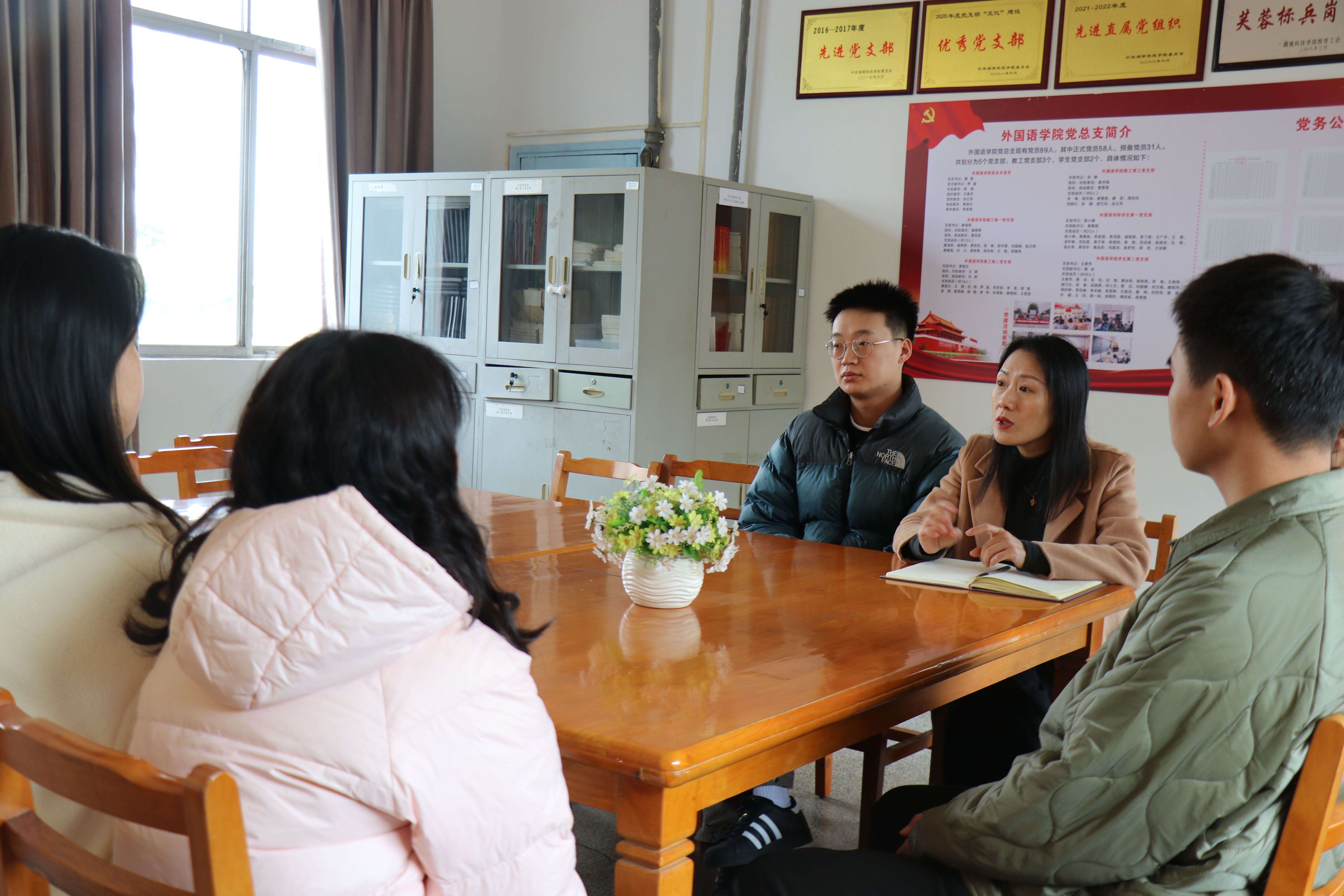 本网讯(通讯员 匡思璇 王素芳)“老师,我是大一的学生,想加入中国共产党我第一步该做什么呀?”在博雅楼306“红心”党员服务咨询站一名新生正在咨询入党事宜。为给广大学生提供入党流程、学业等方面的指导,充分发挥党员的先锋模范带头作用,解决群众急难愁盼的问题,外国语学院党总支于11月起设立“红心”党员服务咨询站,邀请教师党员与学生党员每周二、周五下午在博雅楼306党员活动室值班,为同学们一对一答疑解惑,引导同学们树立前进目标,坚定前进方向。除固定值班的教师党员和学生党员,咨询学生还可以针对学业问题进行导师预约,有针对的解决学业问题。