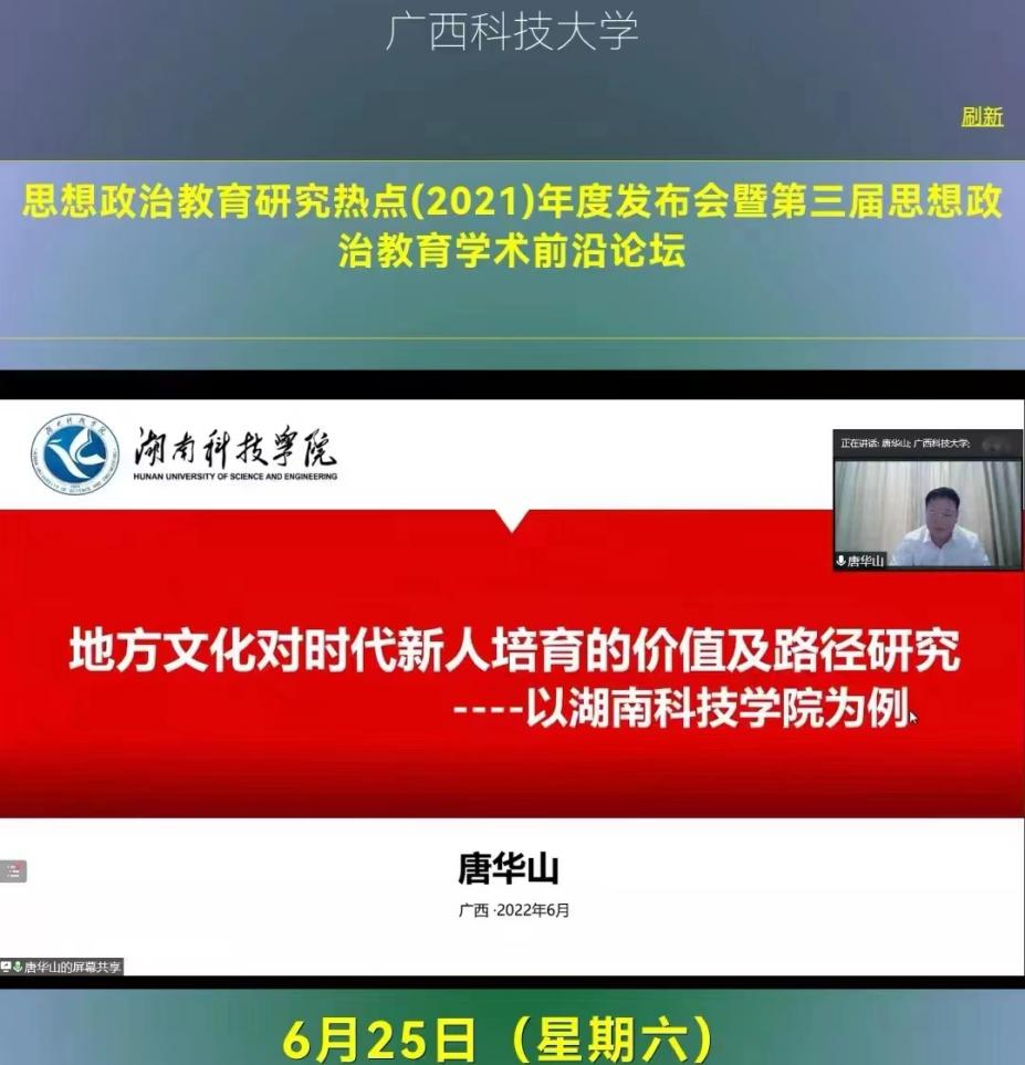 本网讯 6月25日下午,思想政治教育研究热点(2021)年度发布会暨第三届思想政治教育前沿论坛在广西科技大学召开,学生工作部部长唐华山应邀出席会议并线上作了题为《地方文化对时代新人培育的价值及路径研究——以8868官方网站为例》的主旨报告。