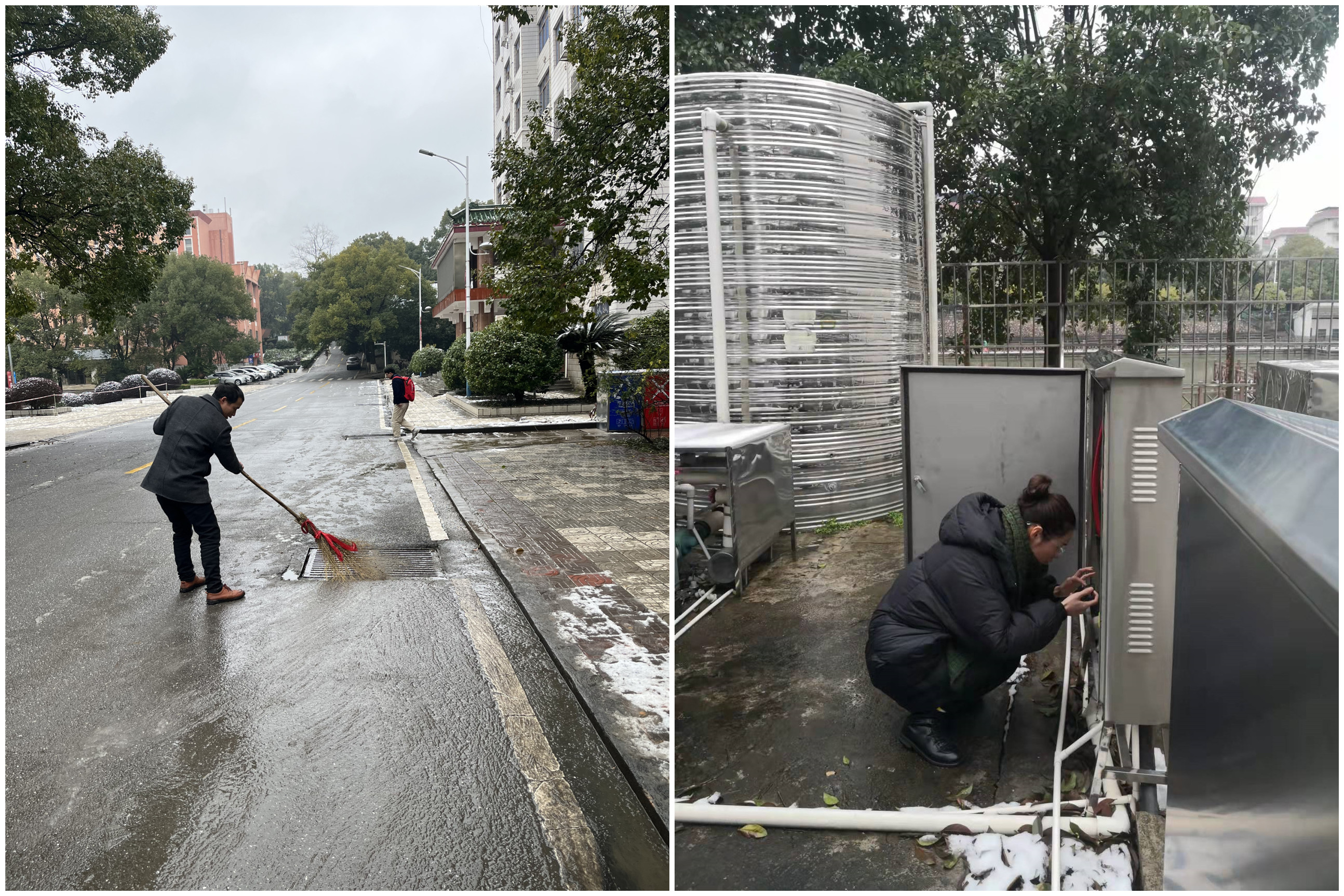 后勤服务中心通过各种渠道做好防寒宣传,普及防寒保暖知识,加大安全教育力度,增强师生防寒防冻意识。盘查防寒抗冻物资,排查校园场所安全,检修相关设施设备,后勤服务中心能源服务部联合水电维修公司、热水供应公司等部门提前对全校水电供应设备、学生宿舍热水空调等设备进行检修,确保热水温度达标,并安排专人24小时值守,以便及时应对突发问题。饮食服务部提前储备食材,要求供货商储备充足货源,确保食材供应充足及时、食堂正常开餐。物管服务部在各主要坡道及台阶处张贴“路面结冰、注意安全”安全提示,保洁人员全员出动,对各主干道路及楼栋台阶进行清雪作业,保障校园道路的通畅,为师生出行提供方便。