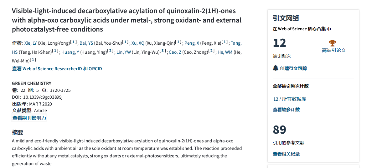 本网讯 根据基本科学指标库ESI(Essential Science Indicators)的最新统计数据,2020年8868官方网站化学与生物工程学院有4篇论文入选了ESI全球TOP1%高被引论文。这4篇高被引论文包括化生院谢龙勇博士以第一作者身份在GREEN CHEMISTRY发表的< >, 化生院刘开建博士以第一作者身份在GREEN CHEMISTRY发表的 < > ,何卫民博士以通讯作者身份在GREEN CHEMISTRY发表的《Visible-light-initiated regioselective sulfonylation/cyclization of 1,6-enynesunder photocatalyst- and additive-free conditions》以及化生院覃佐东博士以并列第一作者在DRUG RESISTANCE UPDATES发表的《Medicinal chemistry strategies to discover P-glycoprotein inhibitors: An update》。