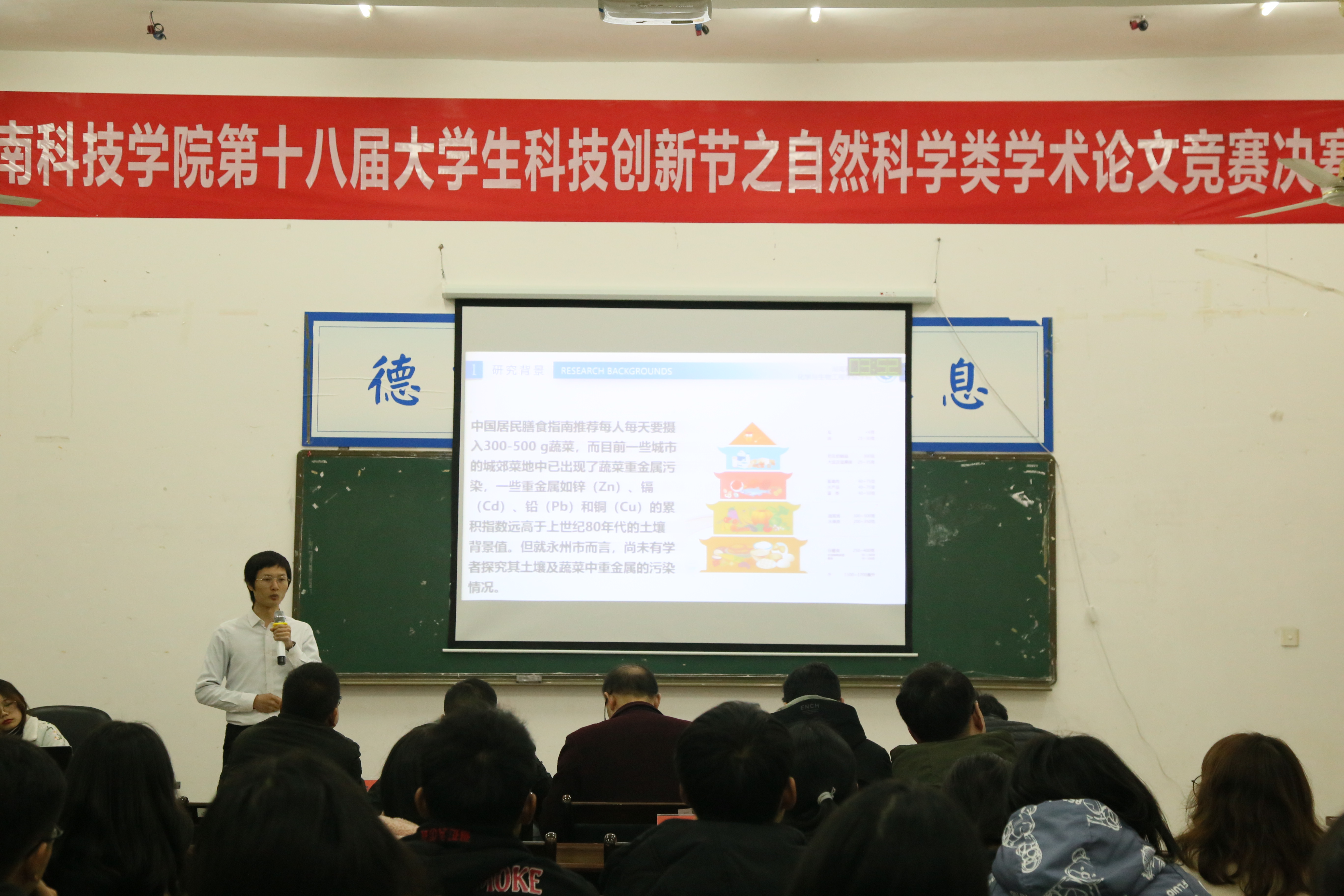 本网讯 12月10日晚,由理学院承办的8868官方网站第十八届科技创新节之自然科学类学术论文决赛在明理楼101举行,土木与环境工程学院院长周基、化学与生物工程学院院长刘小文、科技处副处长包本刚、教务处副处长李文、理学院副院长吴清华担任赛事评委,理学院党总支书记唐卫华、副书记黎建军以及部分组指导老师观看了比赛。