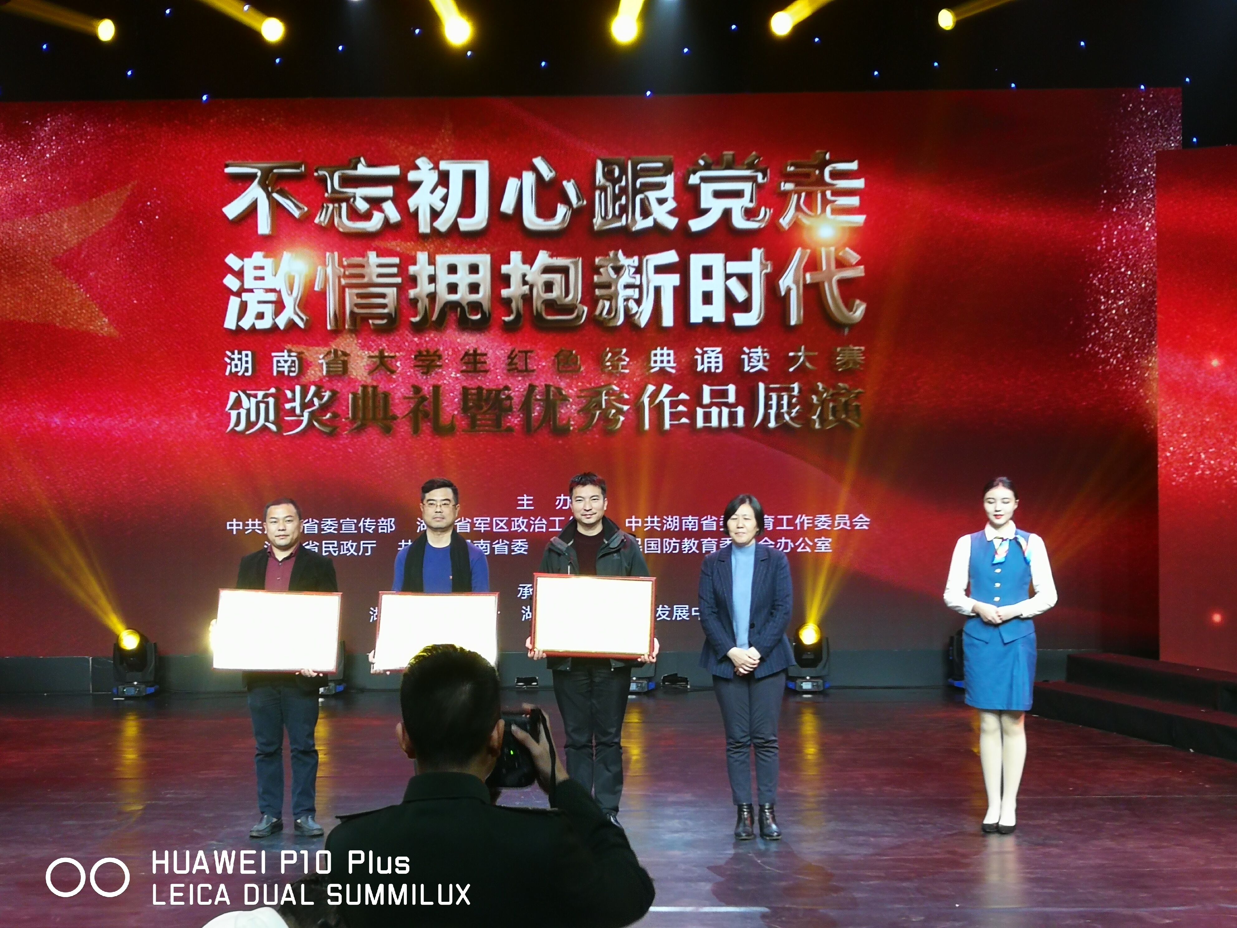 本网讯 由中共湖南省委宣传部、湖南省军区政治工作局、中共湖南省教育工作委员会、湖南省民政厅、共青团湖南省委、湖南省全民国防教育委员会办公室举办的“不忘初心跟党走,激情拥抱新时代”湖南省大学生红色经典诵读大赛颁奖典礼于12月21日在湖南教育电视台举行,我校分别获得了本次大赛的三个类别的奖项,即:“优秀风采奖”、“网络人气奖”以及“优秀组织奖”。