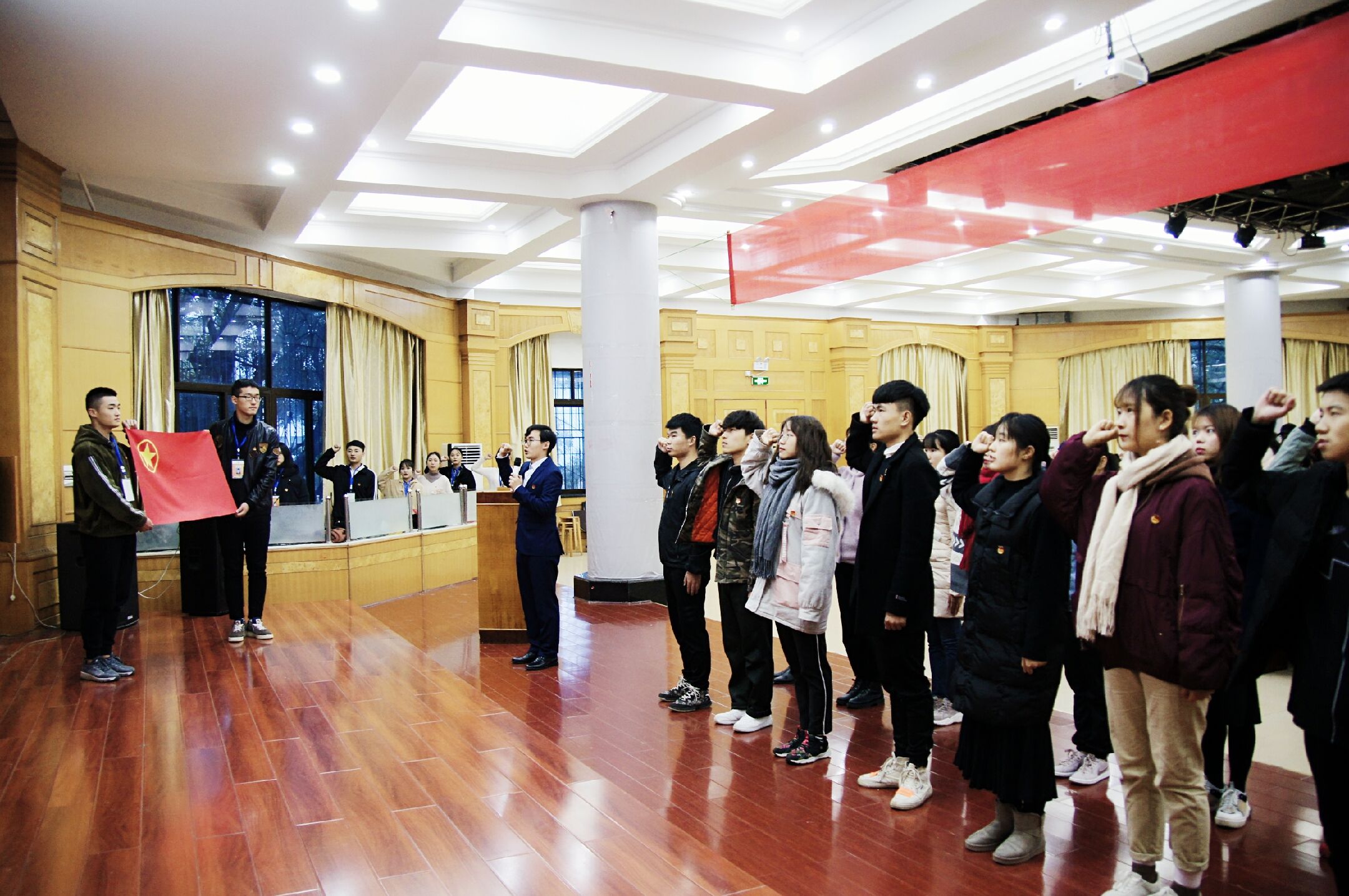 会上,校团委书记刘佳宣读关于成立8868官方网站学生社团联合会团总支以及大学生外语协会、党建协会、习近平新时代中国特色社会主义思想研究与实践协会等13个社团团支部的决定。程智开、刘佳为新成立的团总支和社团团支部授团旗,校学生社团联合会团总支书记陈鑫作为领誓人,带领全体与会人员重温入团誓词。