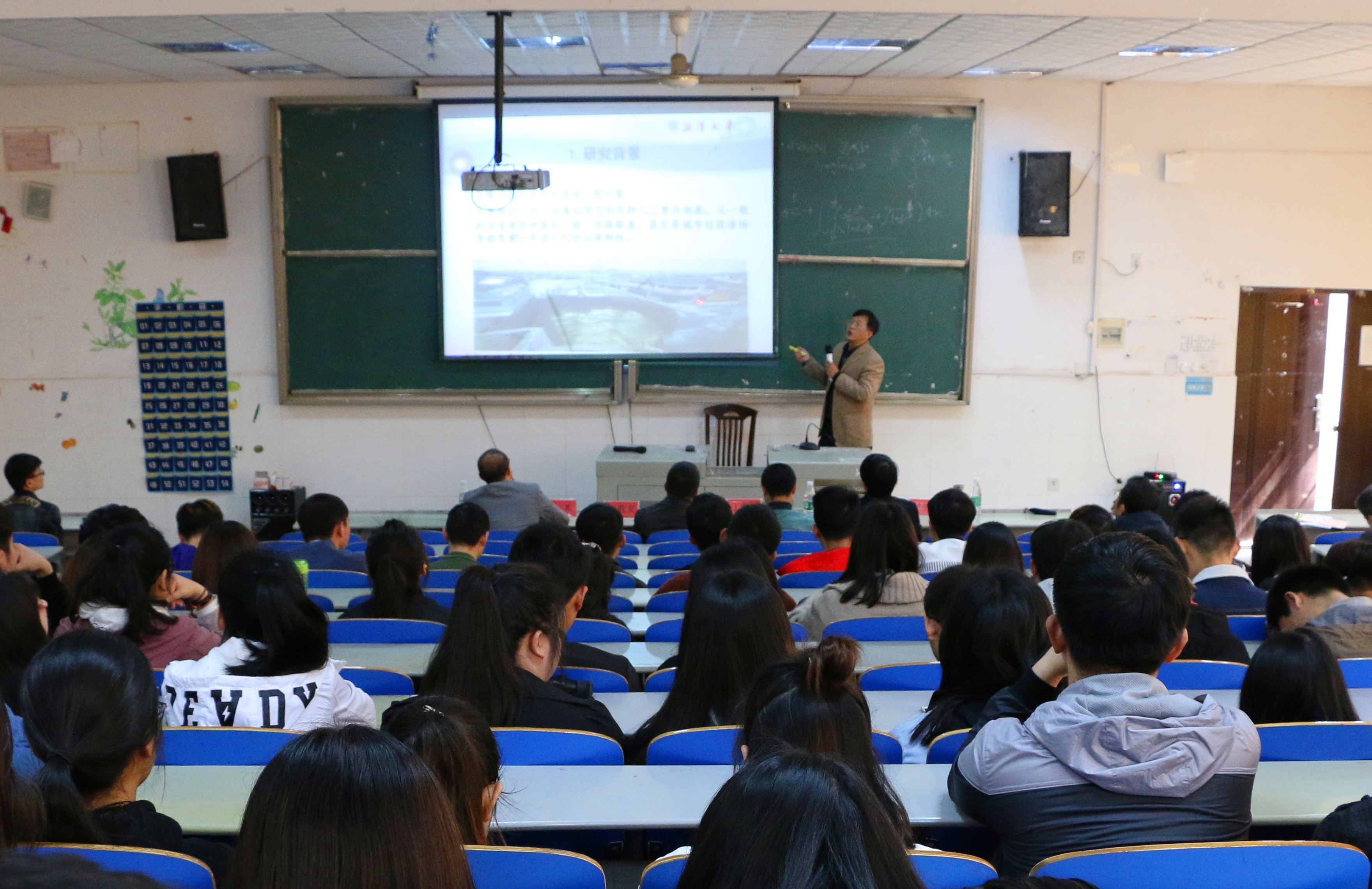 交流中,湘潭大学流变力学研究所副所长、硕士生导师尹久仁教授在逸夫楼为该院的师生作了《倾斜层状横观各向同性弹性地基的半解析解》的学术报告