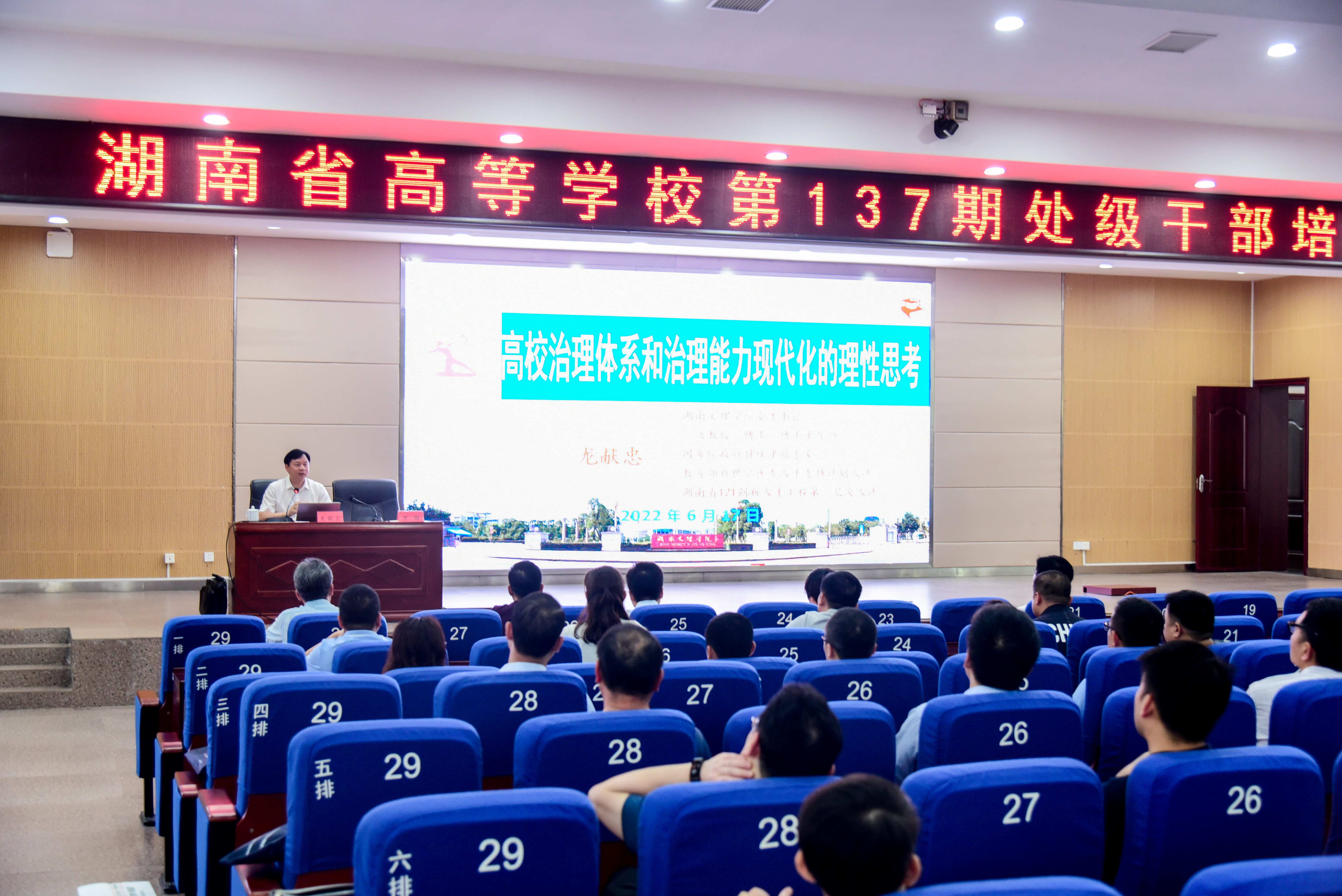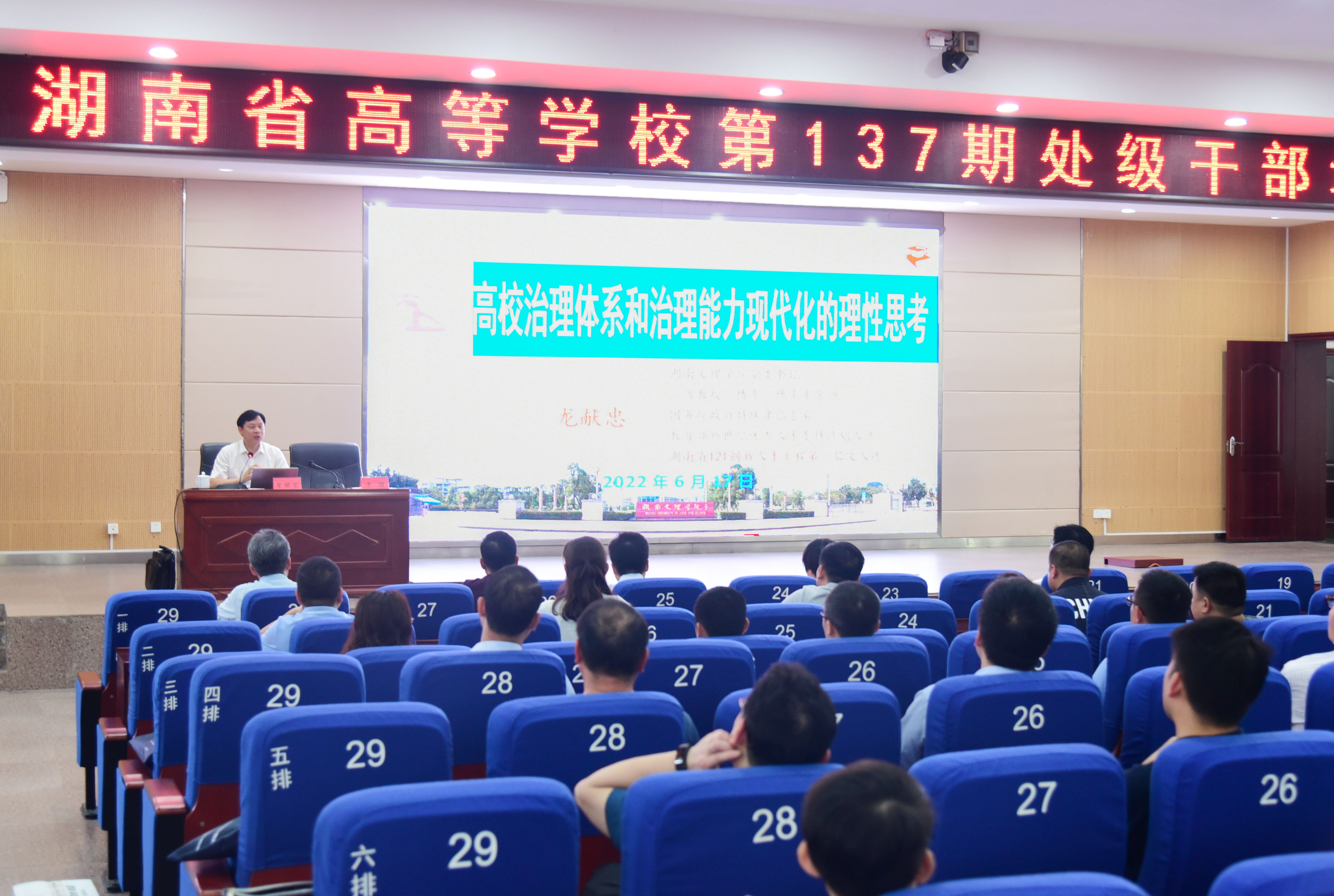 本网讯 6月17日下午,湖南文理学院党委书记龙献忠受邀来校为湖南省高等学校第137期处级干部培训班全体学员作题为《高校治理体系和治理能力现代化的理性思考》的主题讲座。讲座由校长李钢主持。